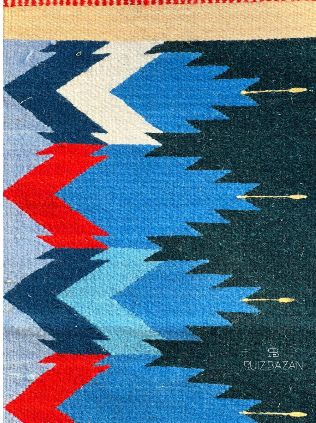 Tapete de lana tejido a mano en Teotitlán del Valle, Oaxaca. Trabajamos con lana de oveja merino de la mejor calidad. Cada diseño está inspirado en las montañas del valle de Oaxaca, la naturaleza que nos rodea y las representaciones zapotecas del estado de Oaxaca, como las ruinas.